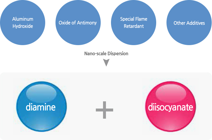 Nano-size flame retardants are added to polyurea liquid A and B, which pass through the upper/lower and left/right routes inside the step-type static section for even mixing and better flame-retardant performance