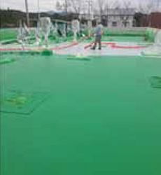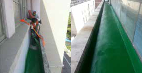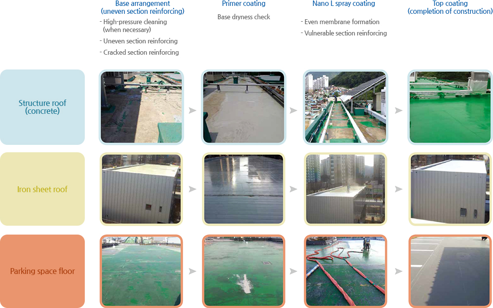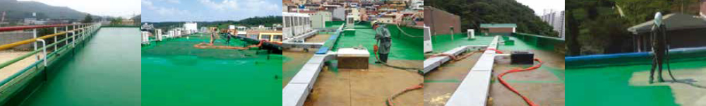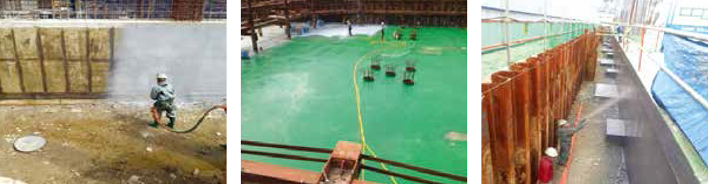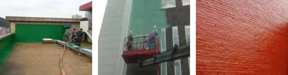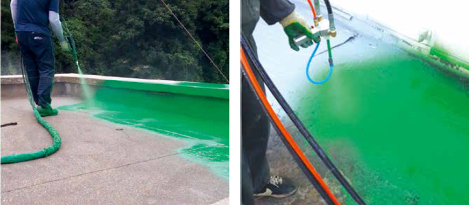 The special polyurea resin used for the NANO L SPRAY method starts to be dried within 5 seconds from mixing and becomes completely hardened enough for walking on it within 30 seconds. Owing to this ultra-fast hardening property of the special material, this method is quite useful for areas of a high risk of liquid-applied membrane waterproofing defects or construction problems.
