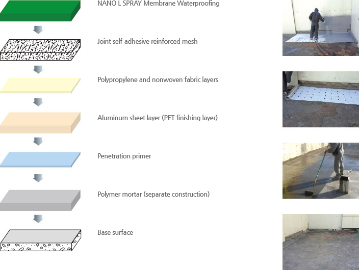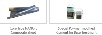 The NANO L composite waterproofing method utilizes the core type nano L waterproofing sheet on which the PVC nanosol, titanium, oxide nanosol, and silicon oxide nanosol. This nano L sheet is combined with polyethylene and then covered with nonwoven fabric. In addition to that, the NANO L SPRAY fluid applied waterproofing method is adopted. As a part of it adheres to the concrete base, no air pocket is formed after construction. Since the contraction/expansion rate is quite low, this composite waterproofing method involves no defect due to damage to the connecting sections.